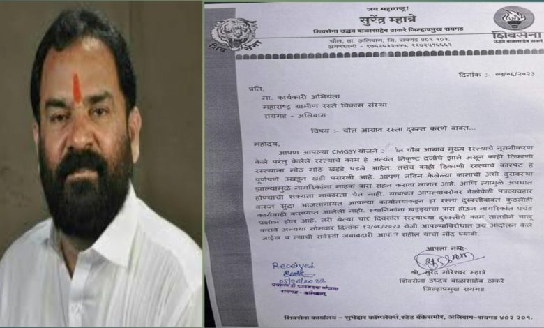 सुरेंद्र म्हात्रे रायगड जिल्हाध्यक्ष शिवसेना ठाकरे यांचा चौल ते आग्राव रस्ता खराब झाल्याने कार्यकारी अभियंता(महाराष्ट्र ग्रामीण रस्ते विकास संस्था) यांना आंदोलनाचा इशारा