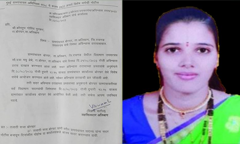 बोरघर-अलिबाग ग्रामपंचायत मधील शेकापच्या उपसरपंच दया मधू धेबे यांच्यावरील शिंदे गटाकडून टाकण्यात आलेल्या अविश्वास ठरावामुळे सर्व सदस्य यांना तहसीलदार अलिबाग यांच्याकडून विशेष सभेसाठी पाठविल्या नोटीस