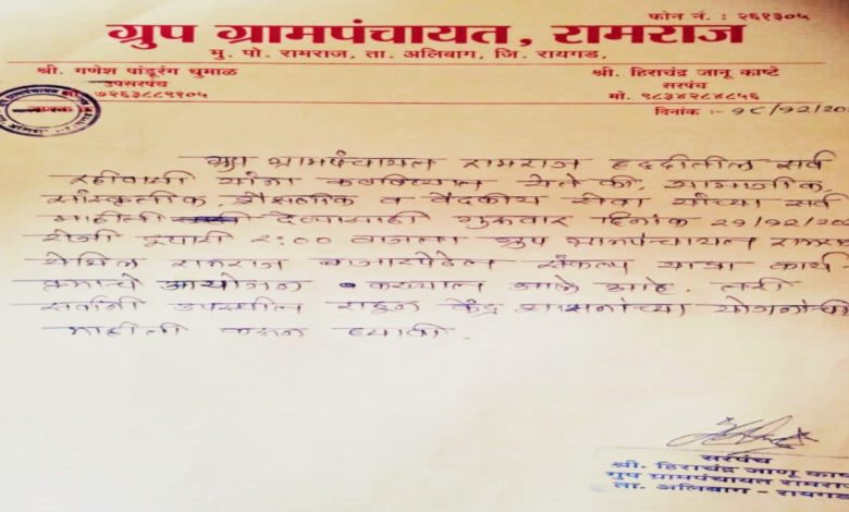 अलिबाग तालुक्यातील ग्रुप ग्रामपंचायत रामराजच्या हद्दीमध्ये दिनांक 21/12/2023 रोजी रामराज बाजारपेठेमध्ये केंद्र शासनाच्या सामाजिक,सांस्कृतिक,वैद्यकीय आणि शैक्षणिक सेवा योजनांची माहिती देण्यासाठी रामराज ग्रामपंचायतीने संकल्प यात्रा कार्यक्रमाचे आयोजन केलेले आहे.