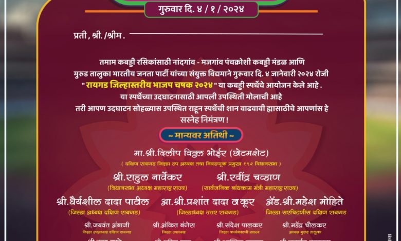 नांदगाव-मजगाव पंचक्रोशी कबड्डी मंडळ आणि मुरुड तालुका भारतीय जनता पार्टी यांच्या संयुक्त विद्यमाने श्री दिलीप भोईर उर्फ छोटंम शेठ [जिल्हा उपाध्यक्ष भाजपा दक्षिण रायगड] आयोजित रायगड जिल्हा मर्यादित भाजप चषक कब्बडी स्पर्धेचे 4/1/2024 रोजी आयोजन केले आहे.