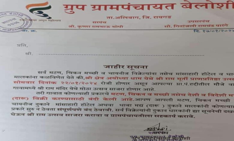 श्रीराम मूर्ती प्राणप्रतिष्ठा उत्सवानिमित्त बेलोशी-अलिबागची ग्रामपंचायत हद्दीतील मटन,चिकन,मच्छी आणि दारूचे दुकाने बंद ठेवावी अशी जाहीर सूचना
