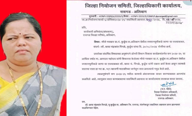 छाया पिंगळे यांच्या जागेत स्मशानभूमी बांधल्यानंतर त्यांच्या जागेतून डोंगरी विभाग विकास कार्यक्रमांतर्गत सन 2024 ते 25 या वर्षात माननीय आमदार महोदय यांनी शिफारस केलेल्या मौजे नवखार ग्रामपंचायत कुर्डूस तालुका अलिबाग येथील स्मशान भूमीकडे जाणाऱ्या रस्त्याबाबत सौ छाया पिंगळे यांनी 30/8/2024 रोजी जिल्हा नियोजन समिती जिल्हाधिकारी कार्यालय यांना तक्रार अर्ज केला होता त्यामध्ये सदरचा रस्ता हा गट क्रमांक 191 या खाजगी मालकीच्या जागेतून जात असल्याचे नमूद केलेले होते